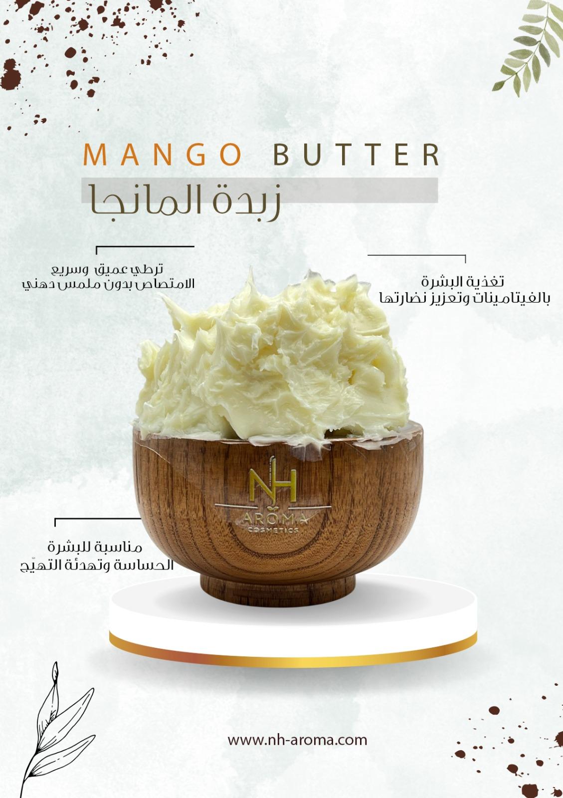 زبدة طبيعية 100% تُستخلص من نواة فاكهة المانجو، تتميز بقوامها الخفيف مقارنة بزبدة الشيا وقدرتها على ترطيب وتنعيم البشرة والشعر دون إحساس دهني ثقيل.