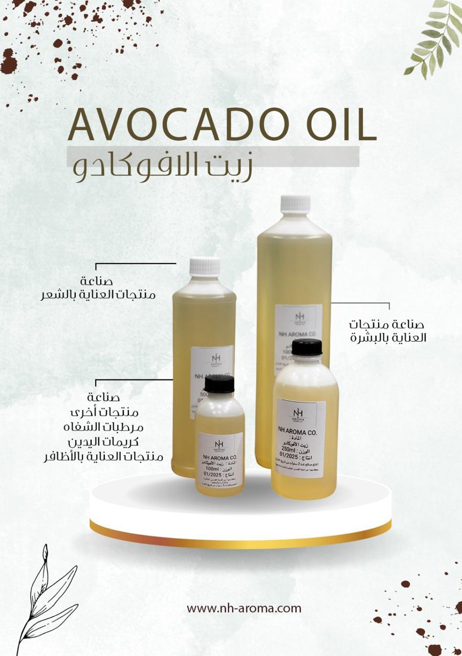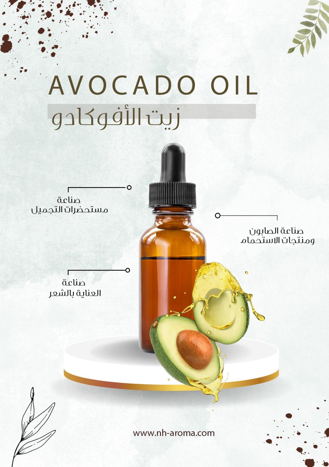 زيت طبيعي 100% مستخلص من لب الأفوكادو الناضج، غني بالفيتامينات والأحماض الدهنية الأساسية، يتميز بقدرته على ترطيب وتغذية البشرة والشعر بعمق دون ترك ملمس دهني ثقيل.